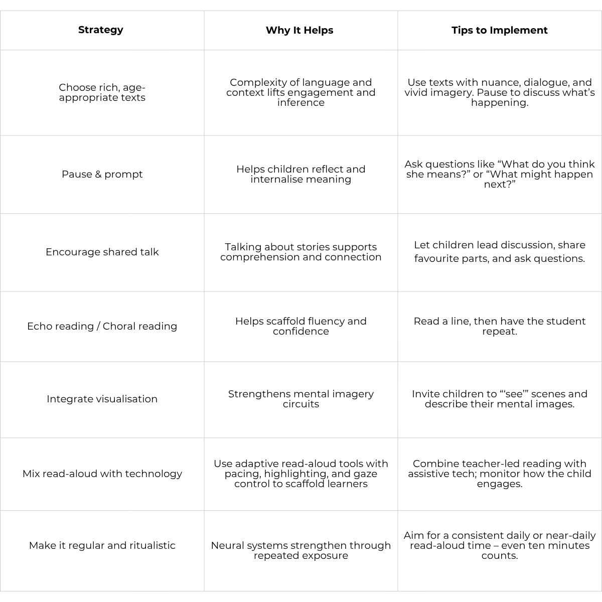To maximise the brain-building benefits of reading aloud, here are strategies you can adopt:
